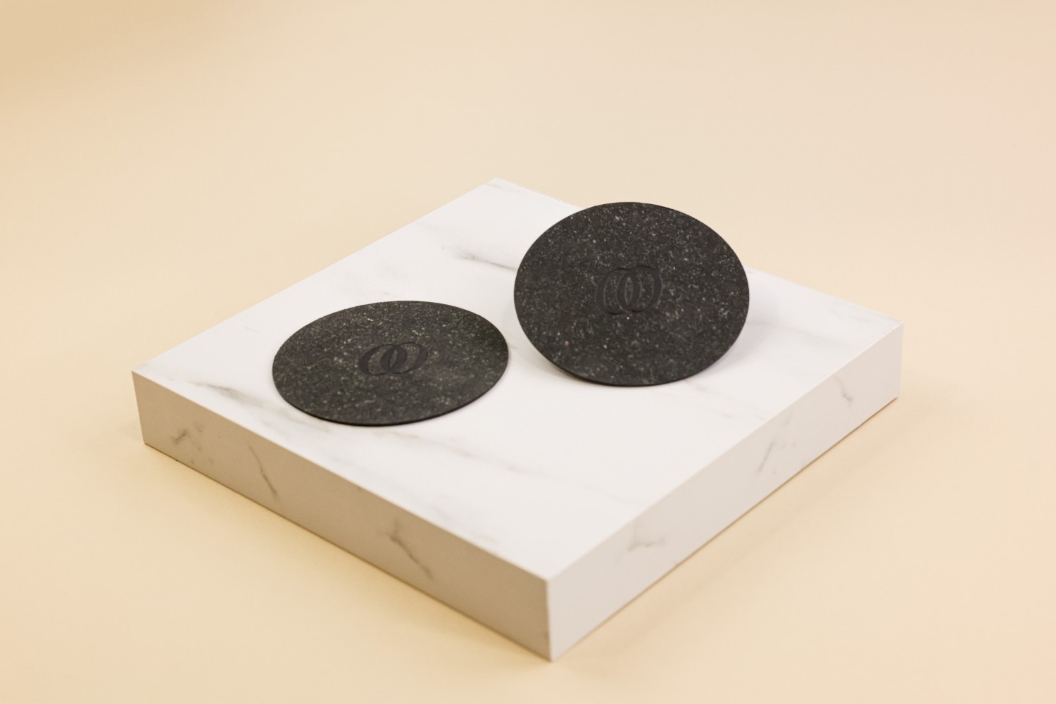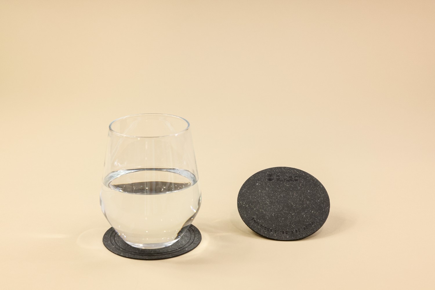 Our raw material coaster comes in a classic circular shape and two timeless colors, black and brown. A sustainable choice enhanced with hot stamping for elegant branding.